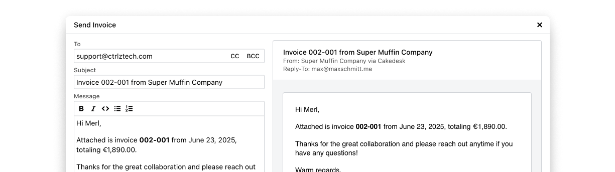 Cakedesk is intuitive, not overloaded and has all the functions I need. And the best thing for me: I get to use my own invoice design.