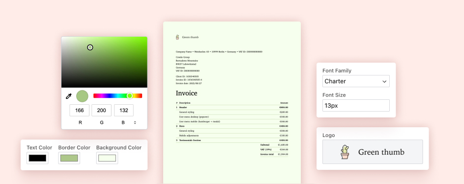 Upload your logo, adjust colors and choose your fonts to make your invoices your own.