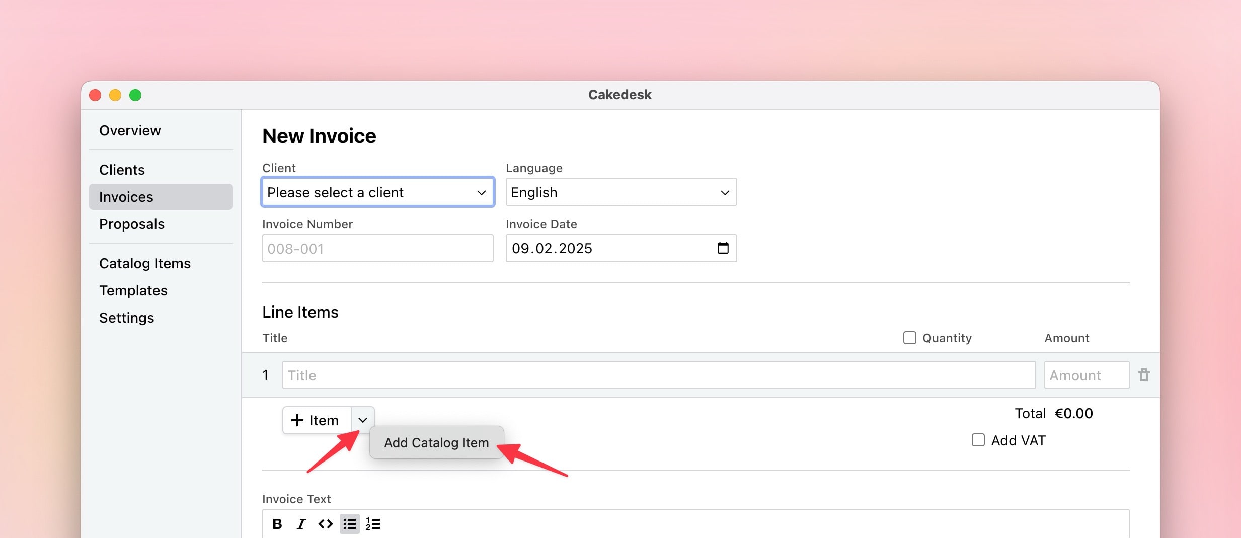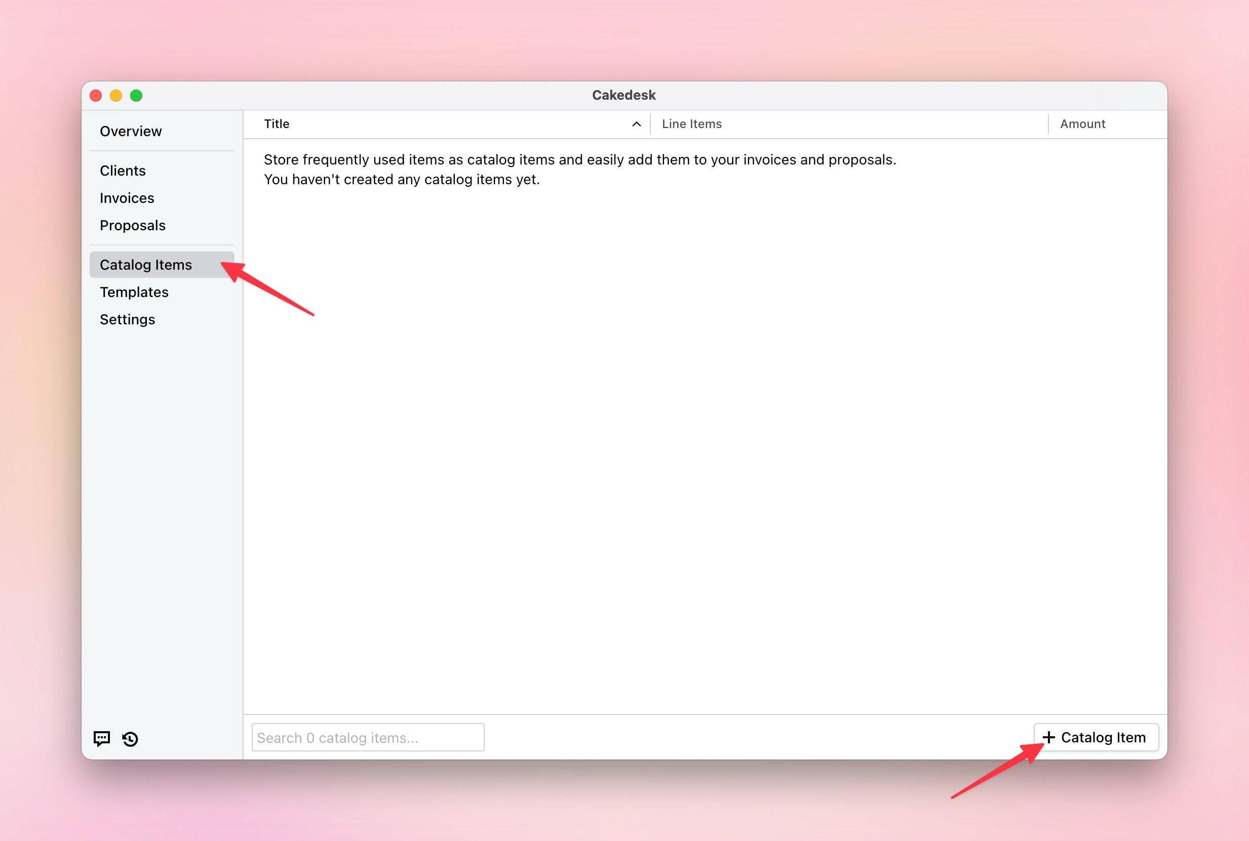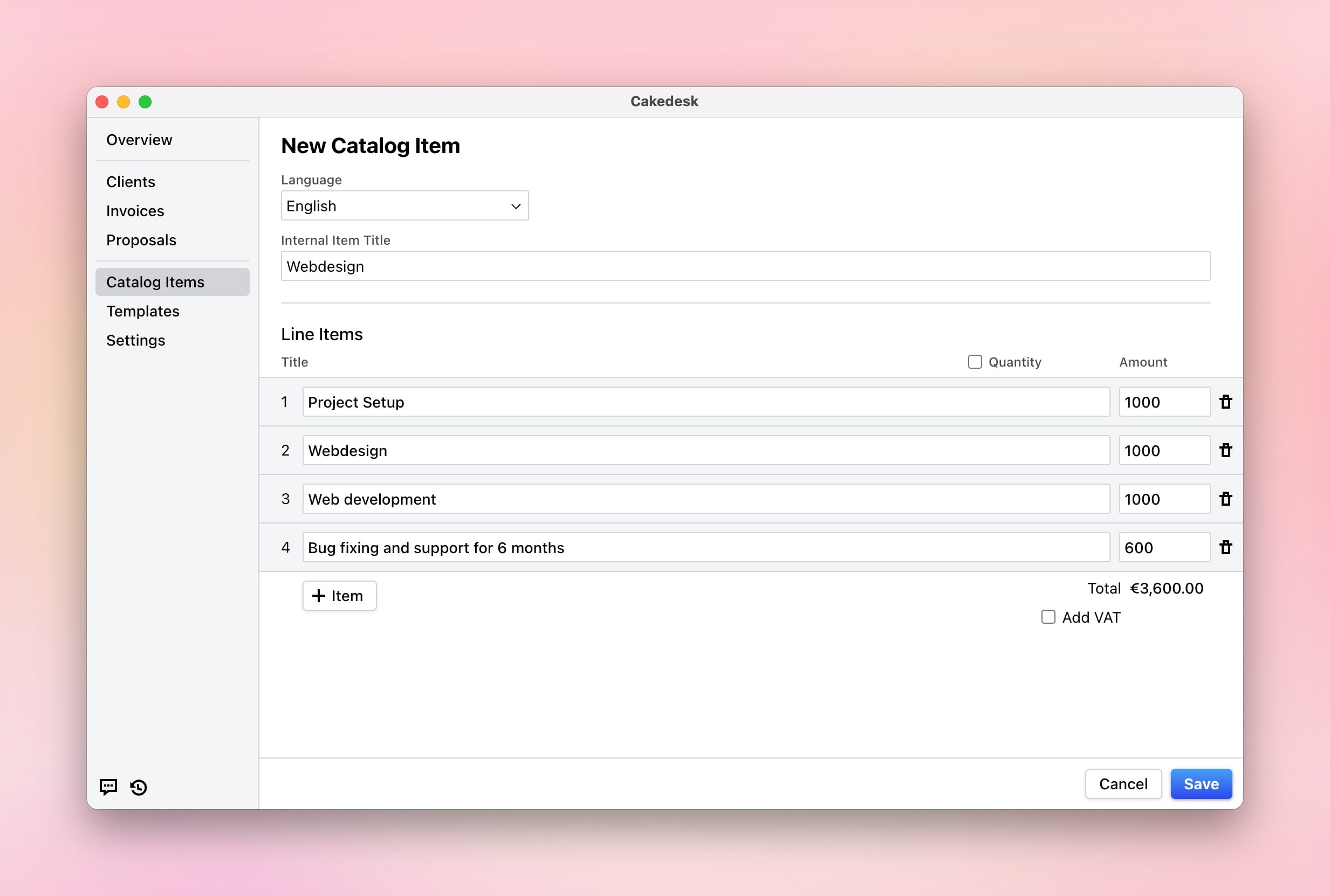 In Cakedesk, you can create reusable catalog items to quickly add products or services to your invoices and proposals.