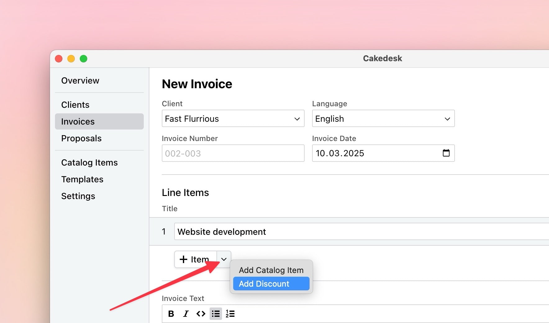 In Cakedesk, you can add discounts to invoices and proposals. Discounts can be added as a percentage or a fixed amount and are applied to the total amount of the invoice or proposal.