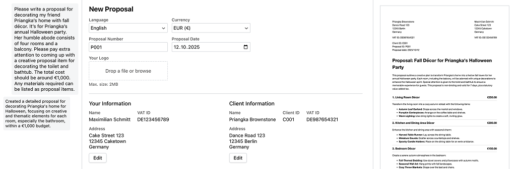 The AI-powered online proposal generator turns your instructions into a convincing proposal within seconds, which you can easily download as a PDF.